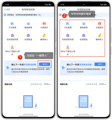 ①若2026年度个税专项附加扣除信息无变动,点击“一键带入”。