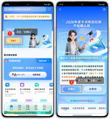 1.下载并打开登录个税APP,点击首页“2026年度专项附加扣除开始确认啦”,进入该功能界面,点击“去确认”。